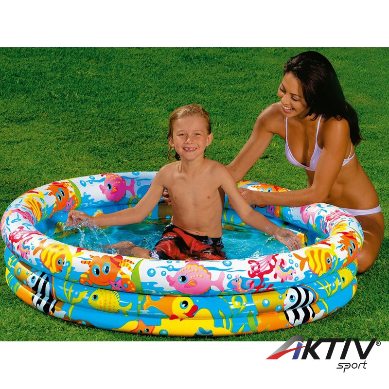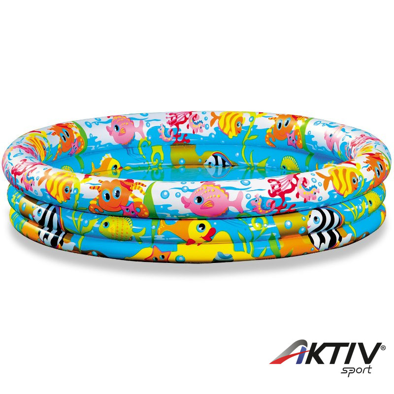 Háromgyűrűs, színes képes, felfújható Intex gyerekmedence. Mérete: 132x28 cm. Űrtartalma: 189 liter. A medence lyukadás esetére javító foltot is tartalmaz. 3 éves kortól ajánljuk használatát!