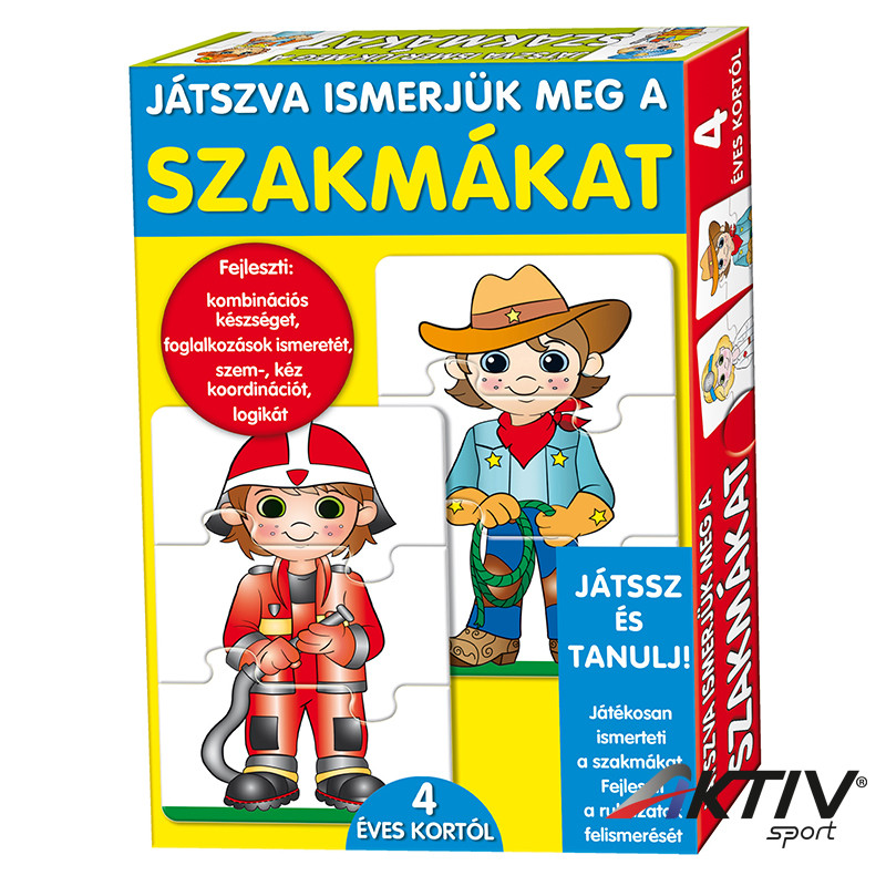 A Játszva ismerjük meg a szakmákat oktatójáték segít a gyerekeknek a számokkal megismerkedni. A játék során a gyerekeknek össze kell rakniuk/fel kell öltöztetniük az adott szakmához tartozó ruházatot viselő emberkéket. A készségfejlesztő számos készség közt fejleszti a finom mozgásokat, kombinációs készséget, logikus gondolkodást, figyelmet, türelmet, memóriát. Egyszerre többen is játszhatják, így a gyerekek az összedolgozást, csapatmunkát és egymás kisegítését is gyakorolhatják. A játék izgalmassá tehető egymást közti versenyzéssel, időre játszással, memória játékkal.