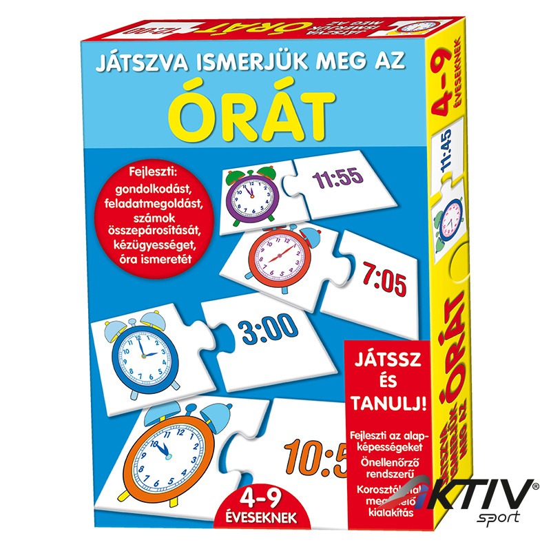 A Játszva ismerjük meg az órát oktatójáték segít a gyerekeknek megtanulni az óra leolvasását. A játék során a gyerekeknek párosítaniuk kell a számokat a képekkel. A készségfejlesztő játék fejleszti a logikus gondolkodást, figyelmet, türelmet, memóriát. Egyszerre többen is játszható, így a gyerekek az összedolgozást, csapatmunkát és egymást kisegítését is gyakorolhatják. A játék izgalmassá tehető egymást közti versenyzéssel, időre játszással.