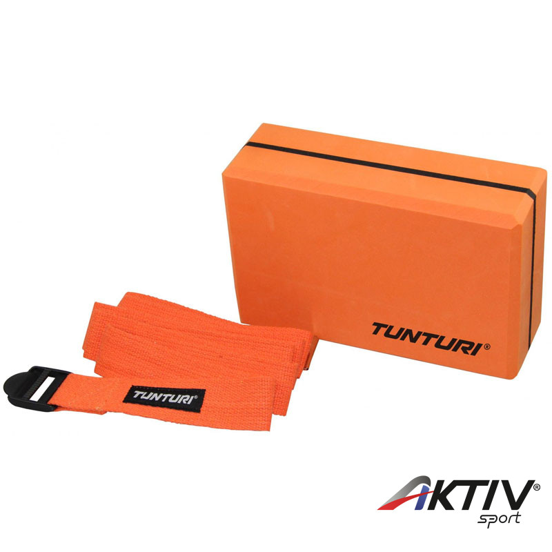 A Tunturi új jóga szettje, mely a megtámasztáshoz és nyújtáshoz elengedhetetlen 23x15 x7,5 cm méretű, EVA szivacs anyagból készült jóga téglát, valamint egy pamutszövetből készült, a végtagok tartására szolgáló 185x4 cm méretű jóga hevederből áll.