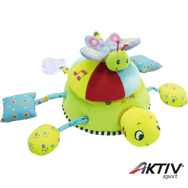 Színes, mintás, puha textil anyagból készült babajáték, mely csörög és rezeg. Lábai és feje húzható, valamint hátán egy le-,feltépõzárazható pillangó pihen. A teknõsbékára egy fogzást segítõ mûanyag rágóka is ra van varrva. Ha a teknõs páncélját felemeli a baba, akkor egy tükörrel találja szemben magát, miközben a játék kacagó hangot ad ki.