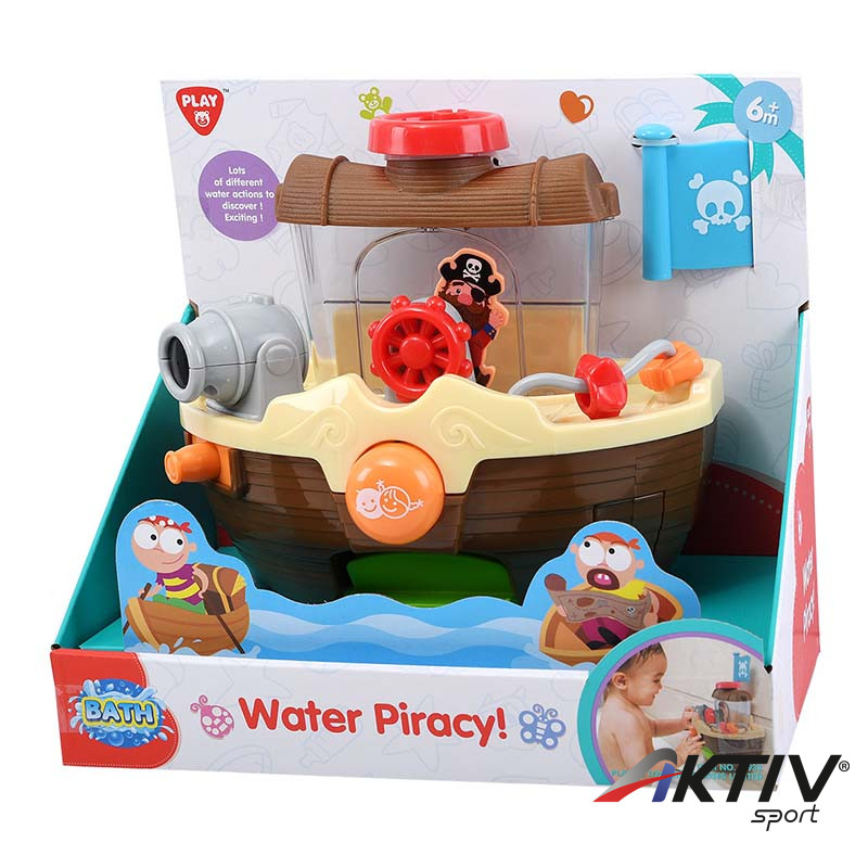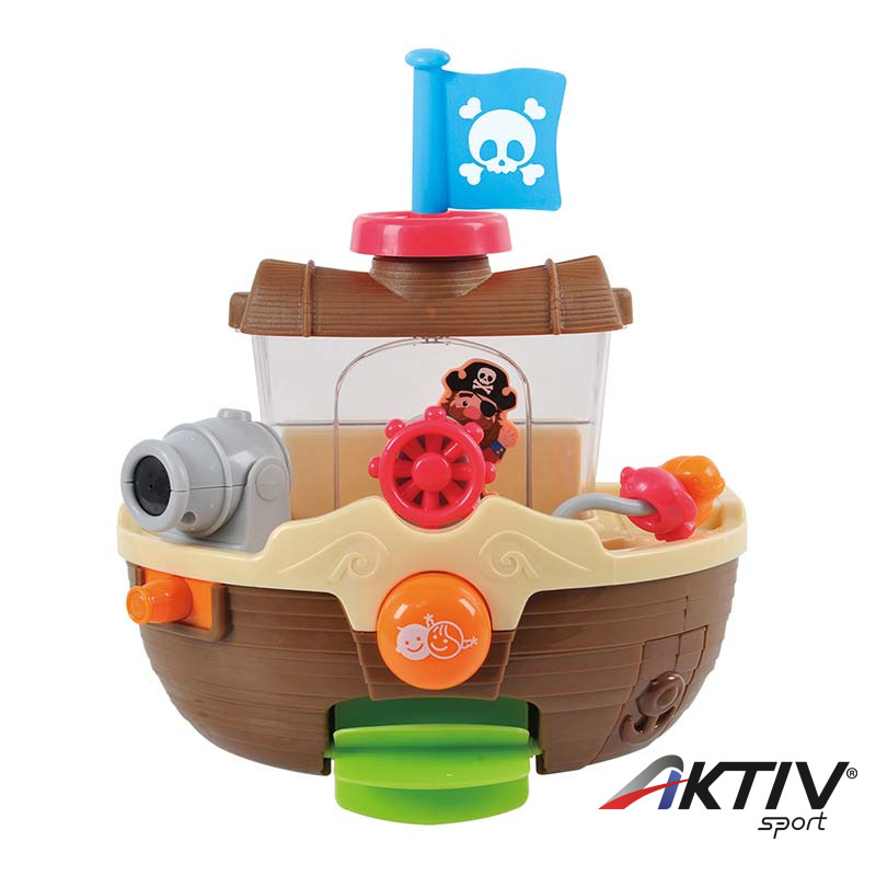 Kalózhajós bébi fürdőjáték, mozgó kalózfigurával, vizet spriccelő ágyúval, vízkerékkel, áttetsző víztartállyal.