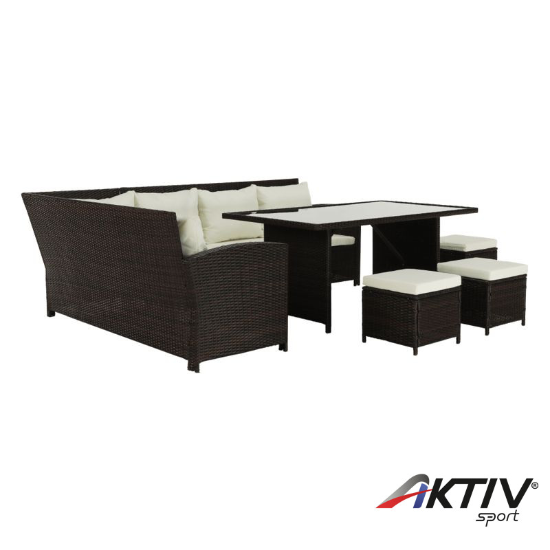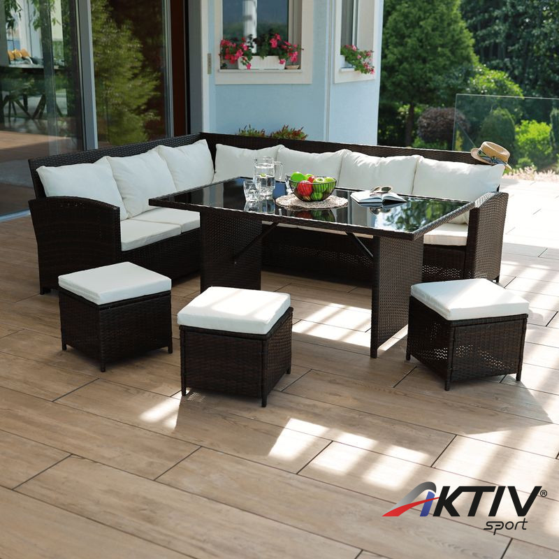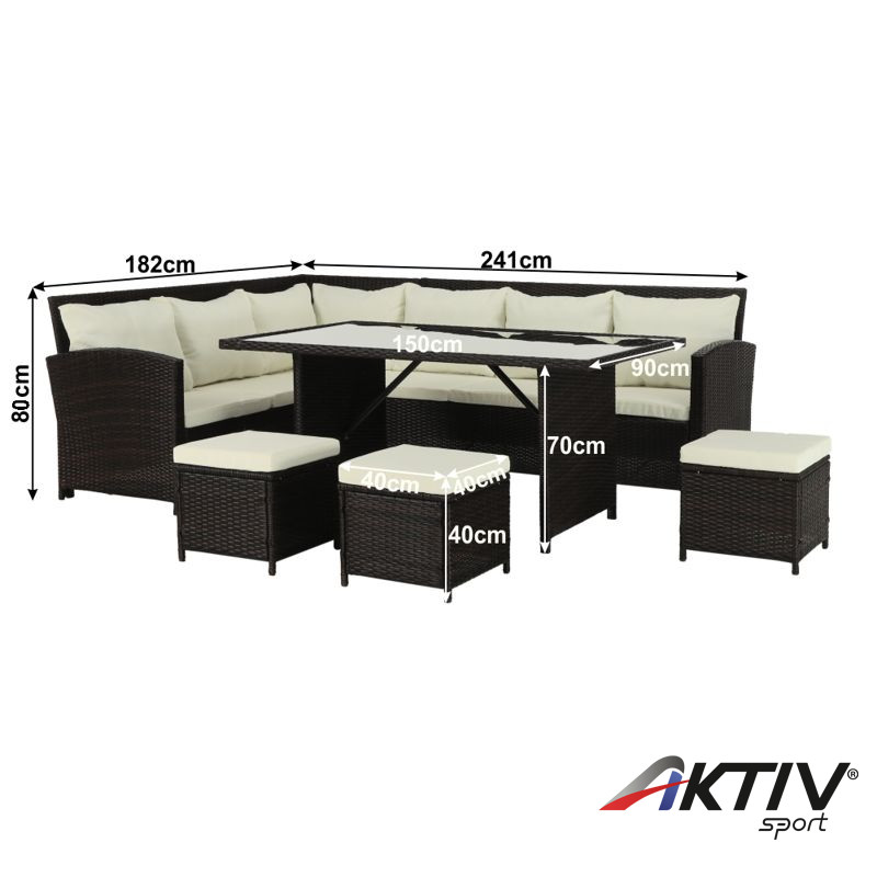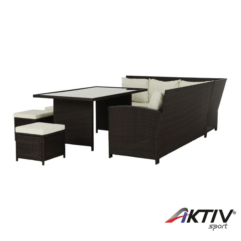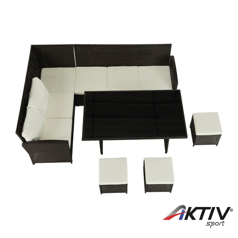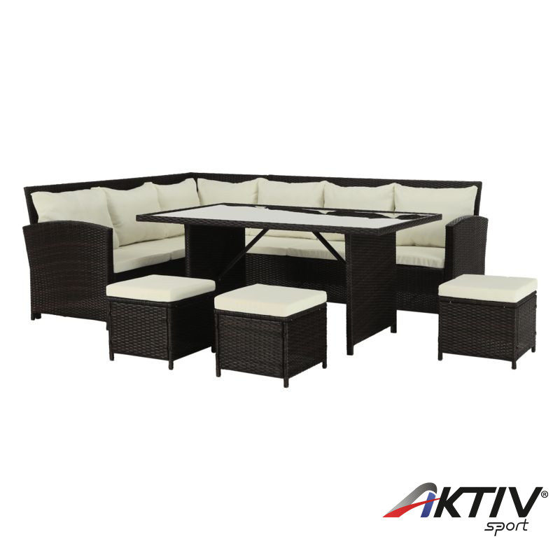 A garnitúra 5 elemet tartalmaz: egy sarokgarnitúrát párnákkal bal oldali kivitelben, három puffot és asztalt edzett üveggel. Magas lábak teszik megjelenését még inkább vonzóvá.