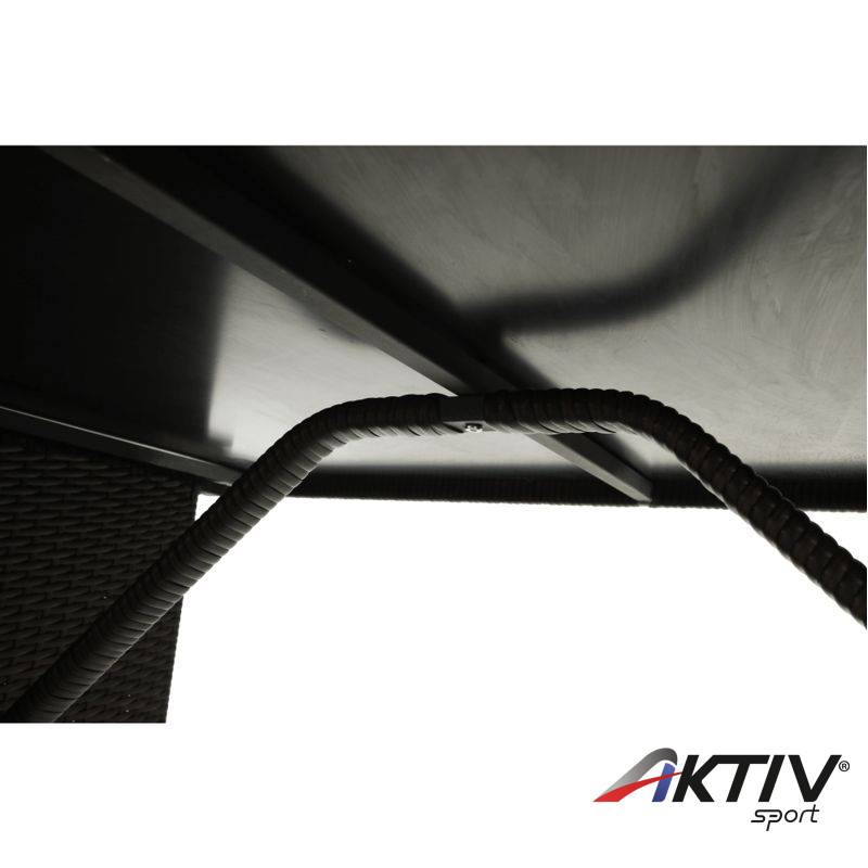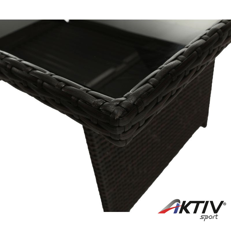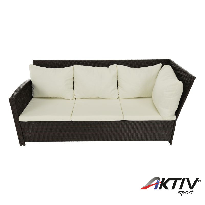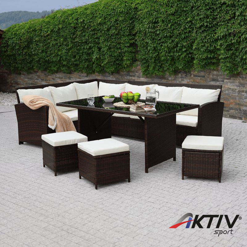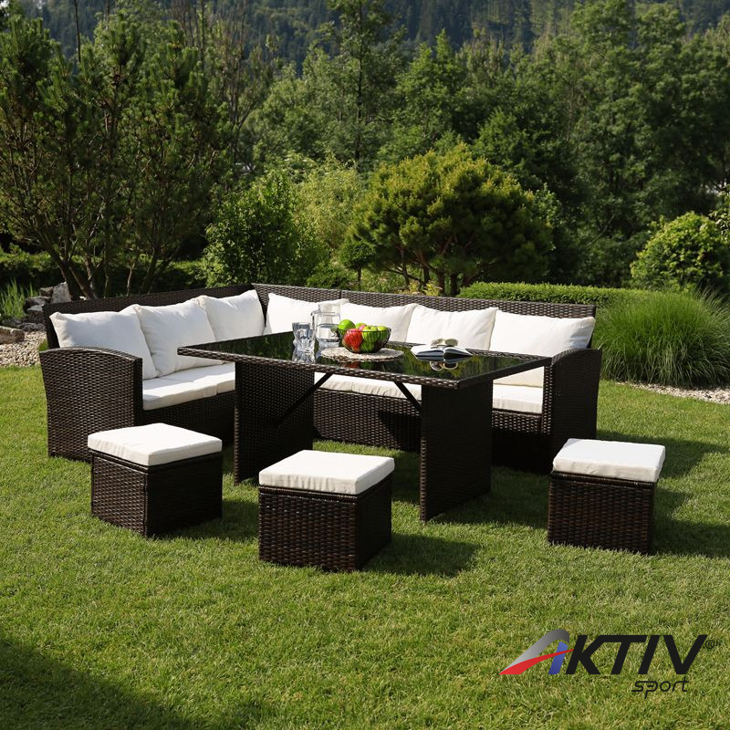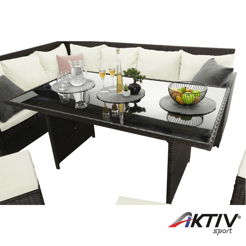 A garnitúra 5 elemet tartalmaz: egy sarokgarnitúrát párnákkal bal oldali kivitelben, három puffot és asztalt edzett üveggel. Magas lábak teszik megjelenését még inkább vonzóvá.