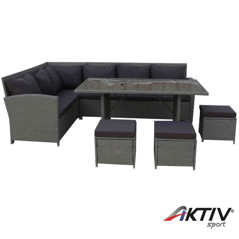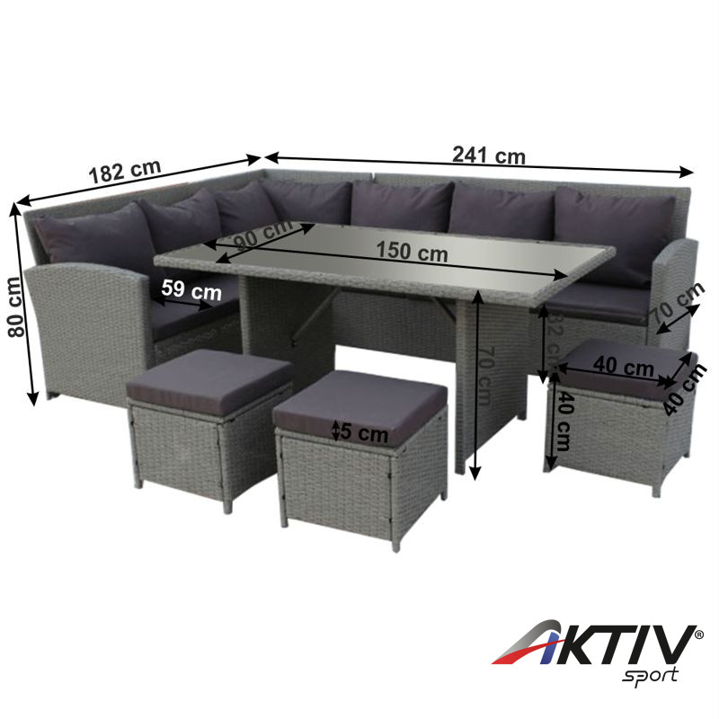 A garnitúra 5 elemet tartalmaz: egy sarokgarnitúrát párnákkal bal oldali kivitelben, három puffot és asztalt edzett üveggel. Magas lábak teszik megjelenését még inkább vonzóvá.