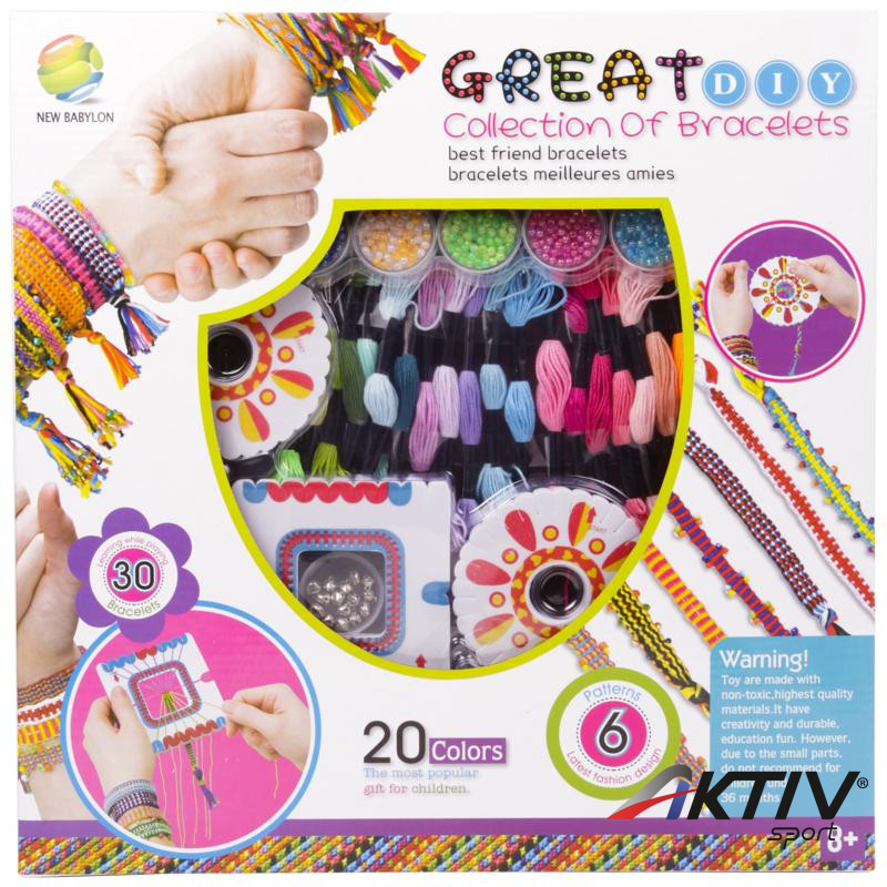 A Készíts saját karkötőt nagy készlettel többféle fonási technikát is elsajátíthatsz, amikkel színes, változatos barátság karkötőket tudsz megalkotni. A fonalakat 6 különböző sablon alapján tudod fonni és fűzni, közben be tudsz iktatni az ékszerbe apró gyöngyöket, csillogó fémkapcsokat is.