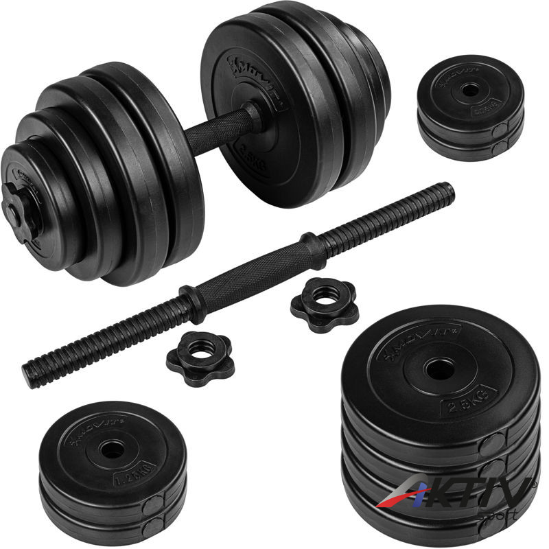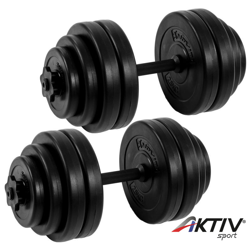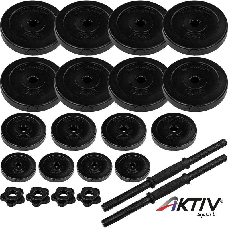 A szett összesen 30 kg súlyt tartalmaz ( 4 x 0,75 kg, 4 x 1,25 kg, 8 x 2,5 kg, 2 db 1 kg-os rúd, 4 db rögzítő).