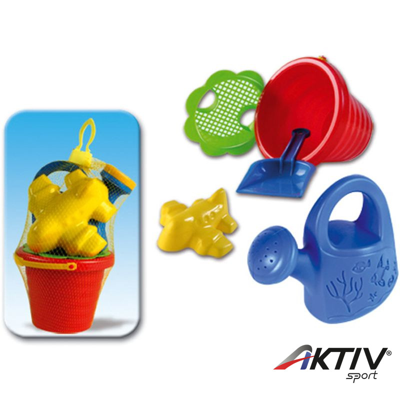 Kis hullámos homokozó szett, 5 db-os. Homokozó játék kisgyermekek részére, hálós csomagolásban. A homokozó készletben egy formával, lapáttal, gereblyével, szitával, locsolókannával építhetsz szuper homokvárakat. A játék erős műanyagból készült.