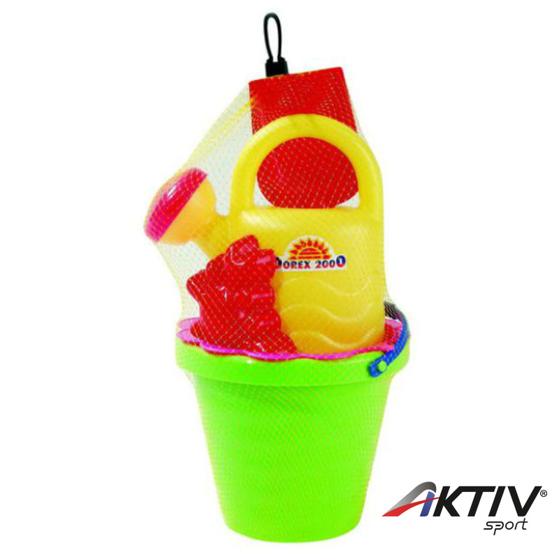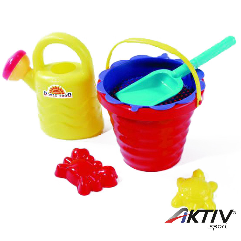 Kis hullámos homokozó locsolóval, szitával, lapáttal és két formával. Könnyű műanyagból készült elemekkel, hogy a kis gyerekek is tudják szállítani.