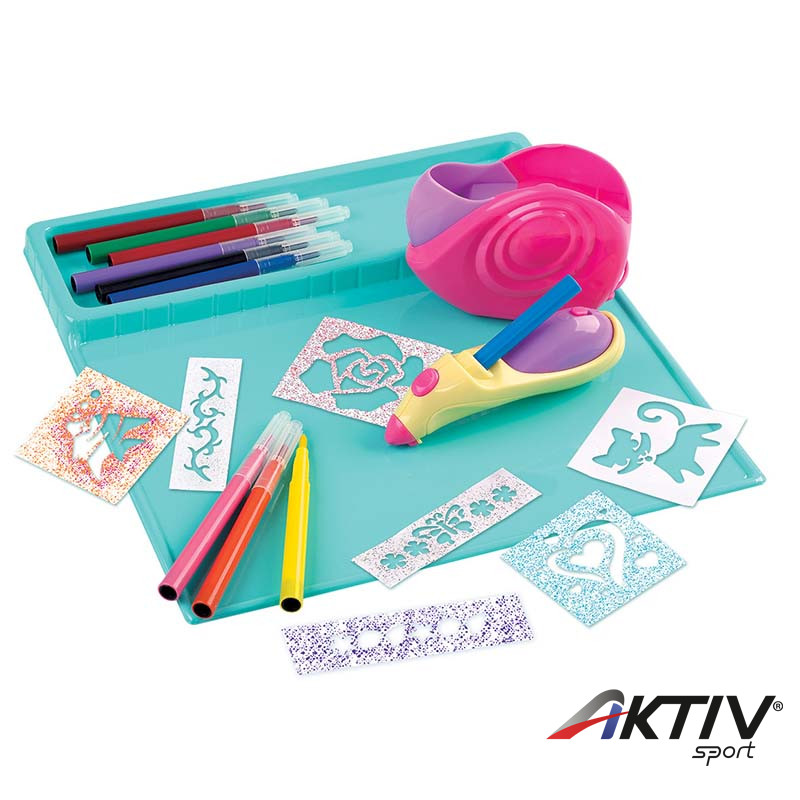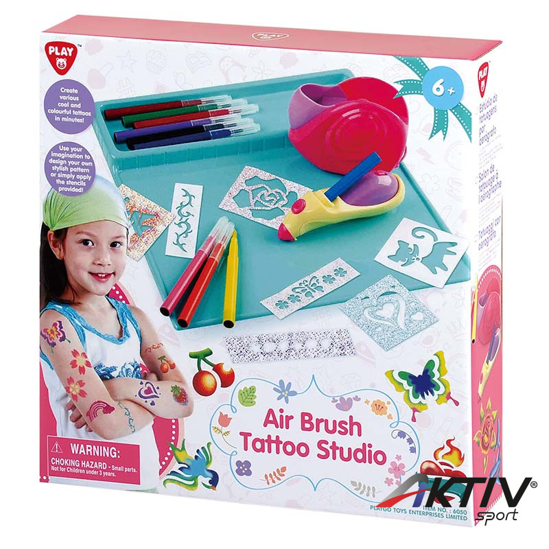 Könnyen használható, festékszóró pisztolyos kompresszoros tetoválógép készlet, 10 db különböző színű patronnal, 27 db különböző öntapadós papír sablonnal, műanyag, rekeszes munkalappal.
