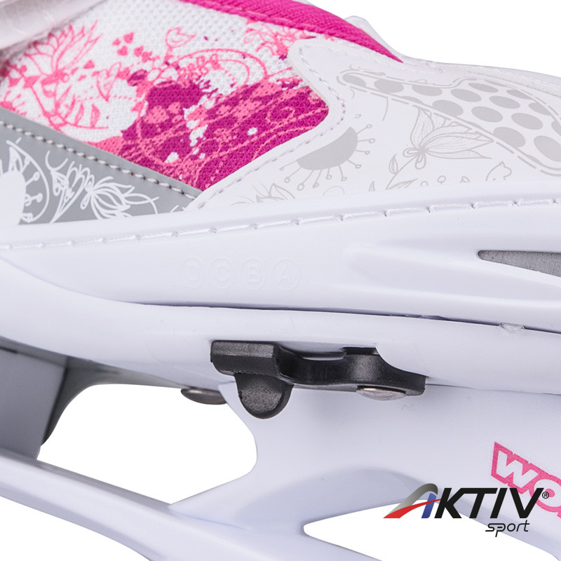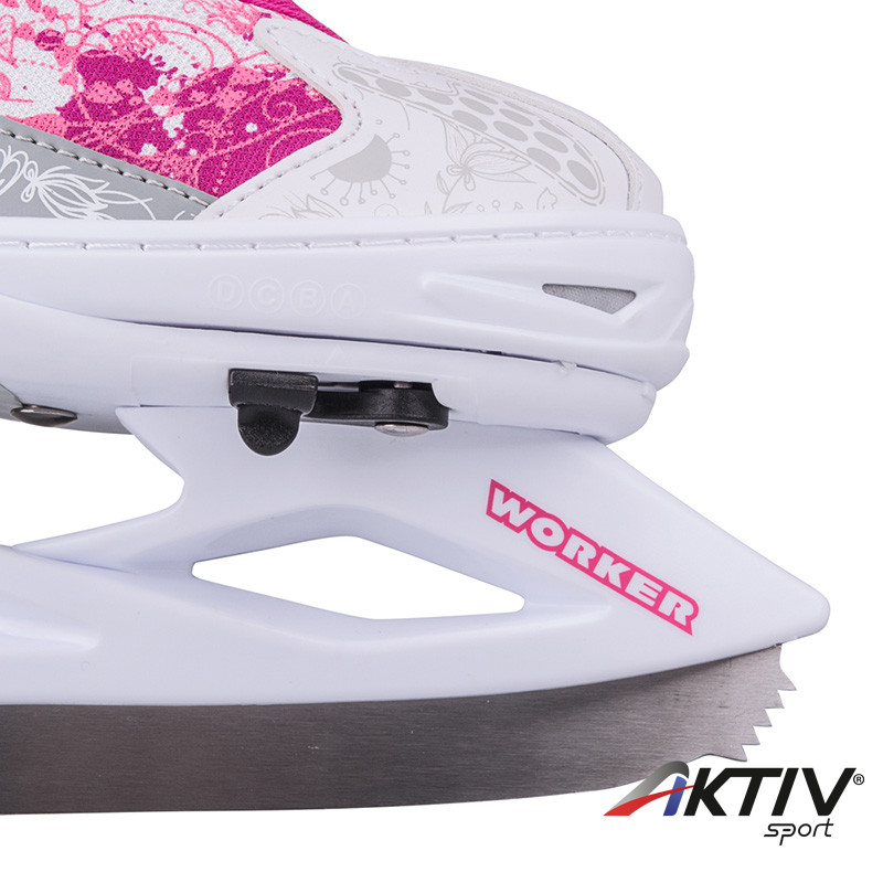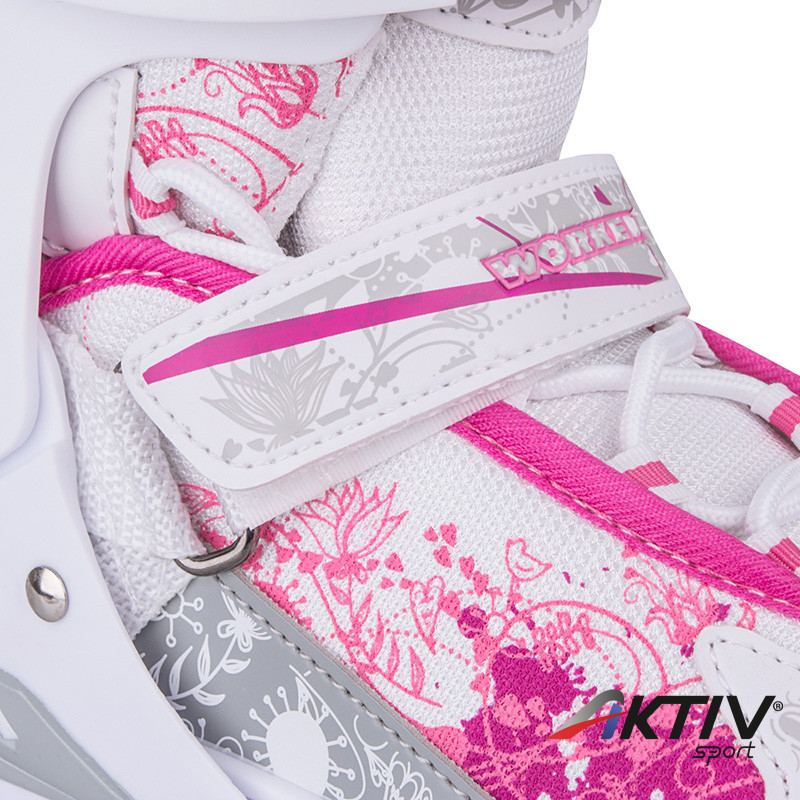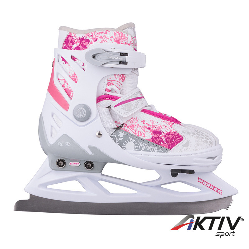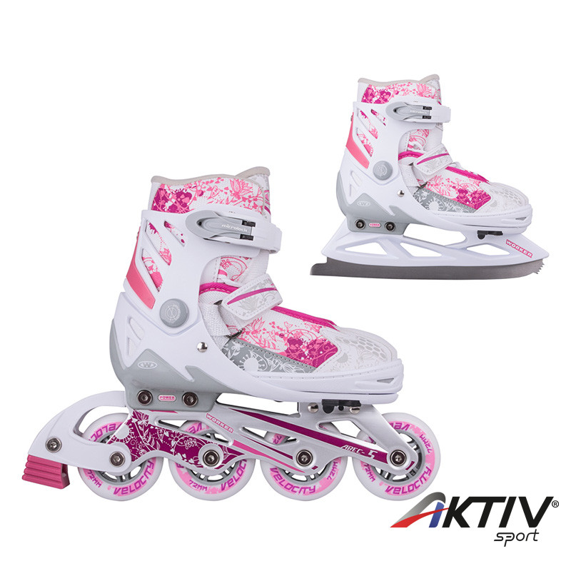 A 2v1 WORKER Pinkola korcsolyát elsősorban a lányok és nők fogják értékelni köszönhetően a színes és virágos díszítéssel ellátott külsejének. A korcsolya oldalán található gomb segítségével egyszerűen és azonnal átállítható a kívánt méretre. Ezenkívül a tartókeretek egyedülálló rendszere lehetővé teszi a téli kés egyszerű cseréjét az in-line alvázra. A felhasznált, magas minőségű gépi megmunkálással készült ABEC 5 Carbon könnyűszerkezetes csapágyak garantálják a sima menetet köszönhetően az alacsony súrlódási ellenállásnak és a megnövekedett ellenállóképességnek a nemkívánatos rezgésekkel szemben. A Safety Ankle rendszer helyes és biztonságos helyzetben tartja a bokát a korcsolyában. A kényelemet a Comfort Fit bélés biztosítja, amelyet kiegészít a biztonsági és egyszerűen beállítható MicroLock csat együtt a tépőzáras rögzítéssel és fűzéssel.