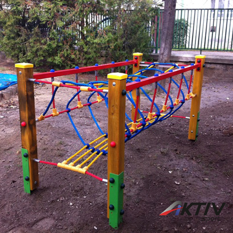- Felépítés: A vázszerkezet I. osztályú bélmentes telített fenyőből készült. A kötélhíd 16 mm-es drótkötélbetétes, vandálbiztos kötél, a csomópontok belgiumi gyártmányú műanyag elemek csavar rögzítéssel.
