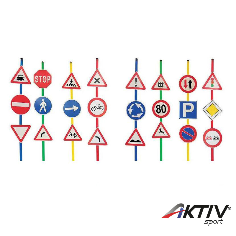 A szitanyomással ellátott nyomtatott közlekedési útjelző jelzőtáblákat egyszerűen és könnyedén ráhelyezhetjük a szettben található tartóoszlopra.