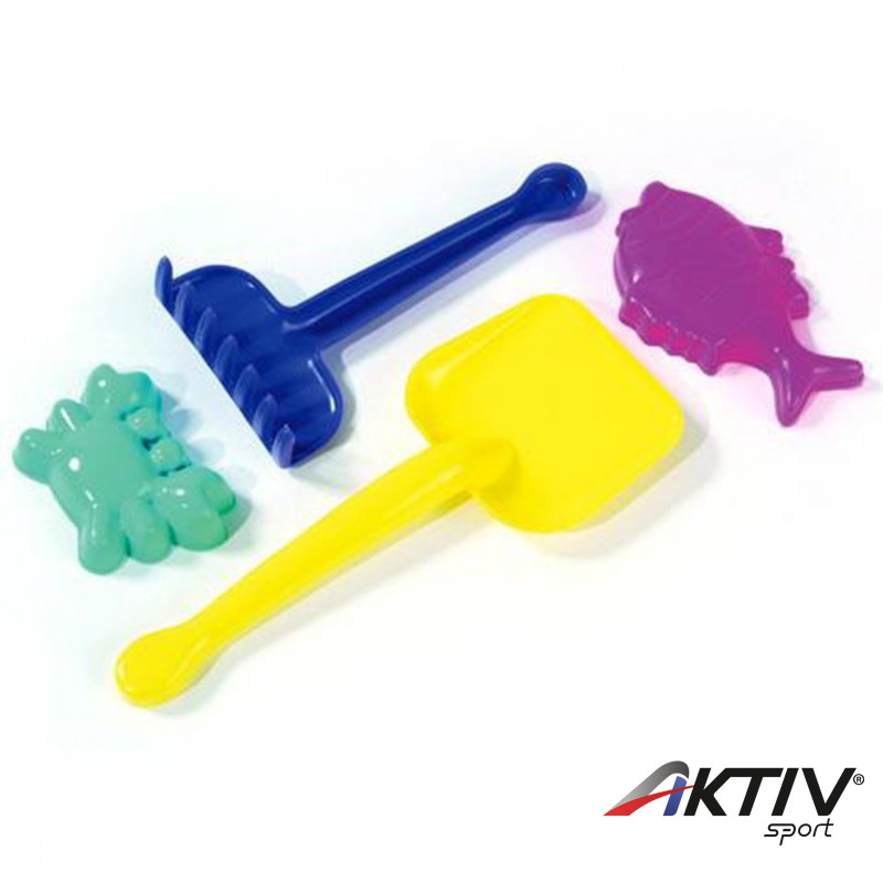 4 részes szett homokozó szett. Tartalma: 1 db lapát, 1 db gereblye, 2 db homokozó forma. Több színben kapható.