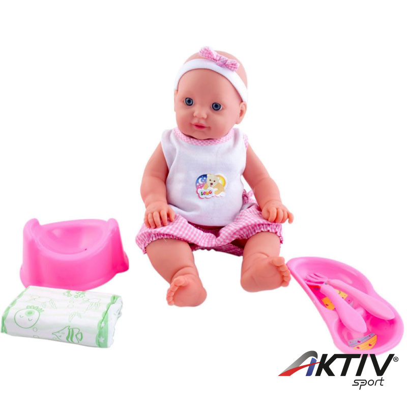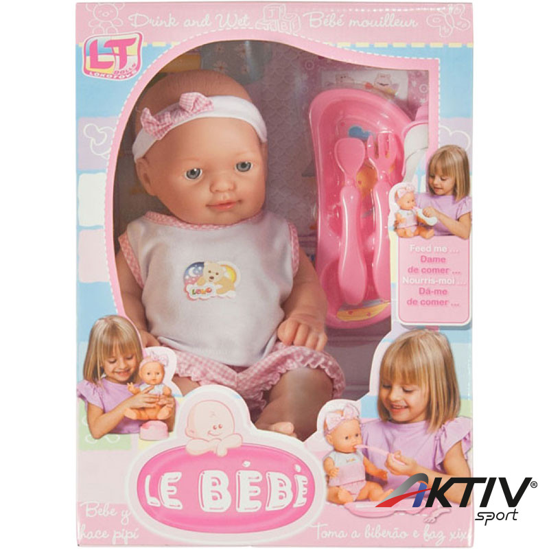 Kemény testű Loko vanília illatú játék baba. A babát megitatva pisil is. A babához tartozik egy cumisüveg, pelenka, etetőtál kanállal és villával, valamint egy bili. A baba mérete 43 cm. 10 hónapos kortól ajánljuk.