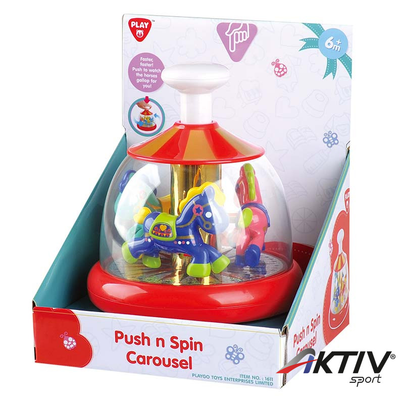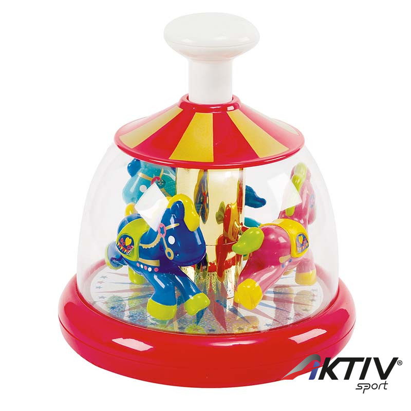 A játék tetején lévő gomb lenyomására a körhinta színes lovacskái elkezdenek körbe-körbe forogni, miközben a játék kellemes, csilingelő hangot ad.