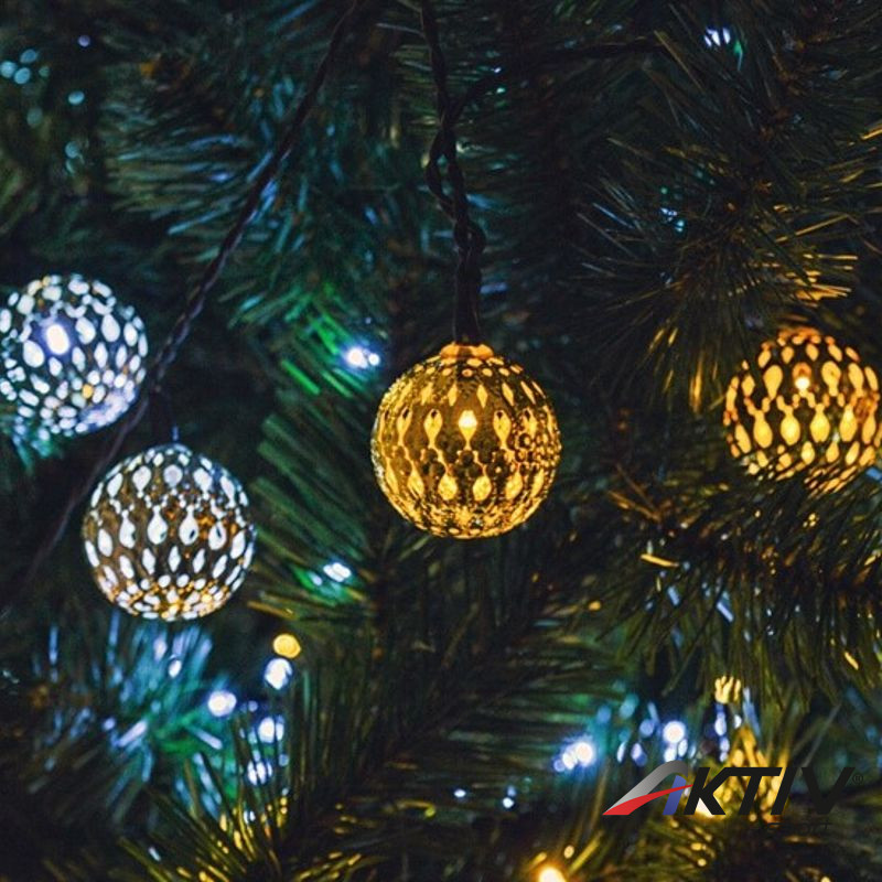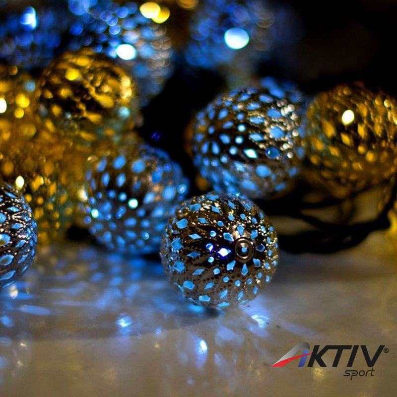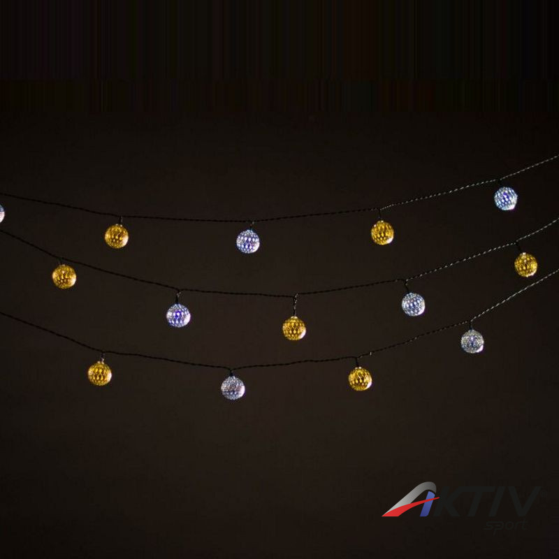 Közel-keleti hangulatú, elegáns fényfüzér, aminek apró fémgömbjei hideg fehér és meleg fehér színekben váltakoznak.