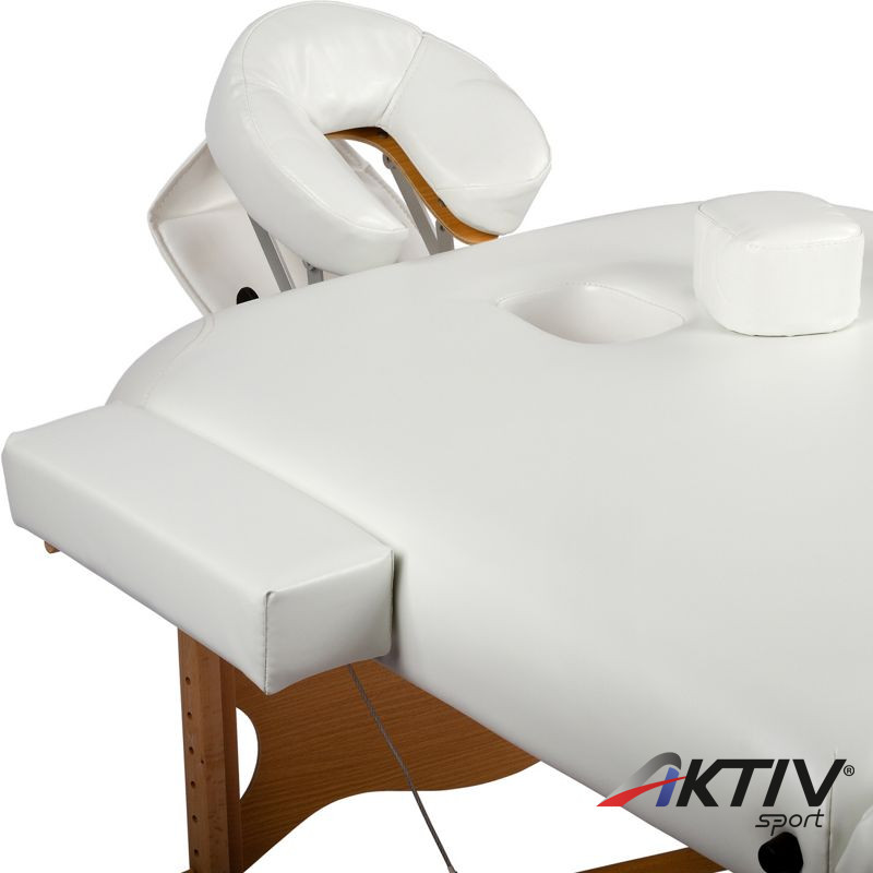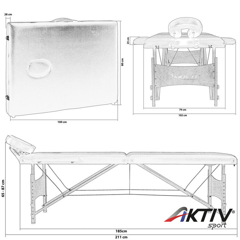 Hordozható masszázságy melynek magassága 9 fokozatban állítható, 65 és 87 cm között. A fejtámasz szintén állítható, valamint a 25 cm-es kartámaszok levehetőek.