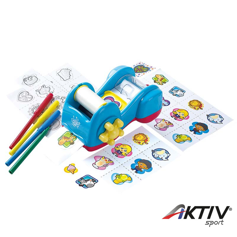A készletben megtalálható a matricakészítő gép, melybe a festett vagy rajzolt sablonokat bele lehet tenni, hogy azon áttekerve létrejöjjön a matrica.