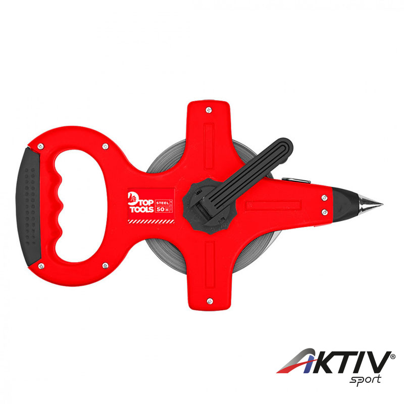 Erős műanyag házas, 50 m hosszúságú acél mérőszalag.