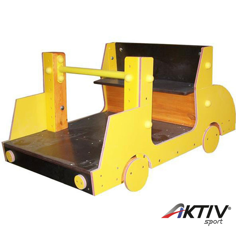 Színes HDPE 20 mm vastag műanyagból készült autó formájú felépítményből, vízálló rétegelt falemezből, rétegragasztott borovi fenyőből, porfestett színes kapaszkodóból áll, mely a talajba betonozható galvanizált, porfestett lábhoz csatlakozik.