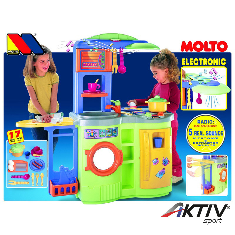Beépített Jazz/Salsa/Rock zenét játszó rádióval. Mikrosütő realisztikus hangokkal, hűtő, mosógép, vasaló állvány, tárolók, edények stb.