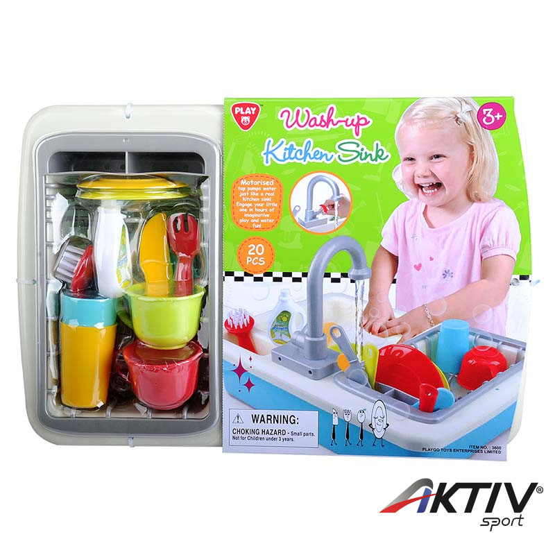 20 db-os, funkciós mosogató készlet, valósághű, vízszivattyús csappal, tányérokkal, poharakkal, evőeszközökkel, kiskefével és edényszárító résszel.