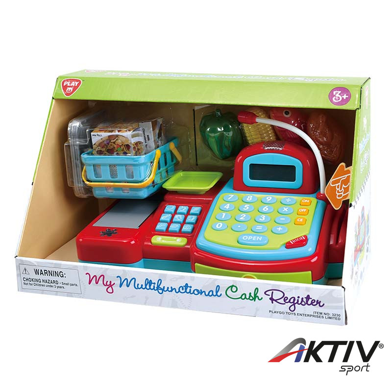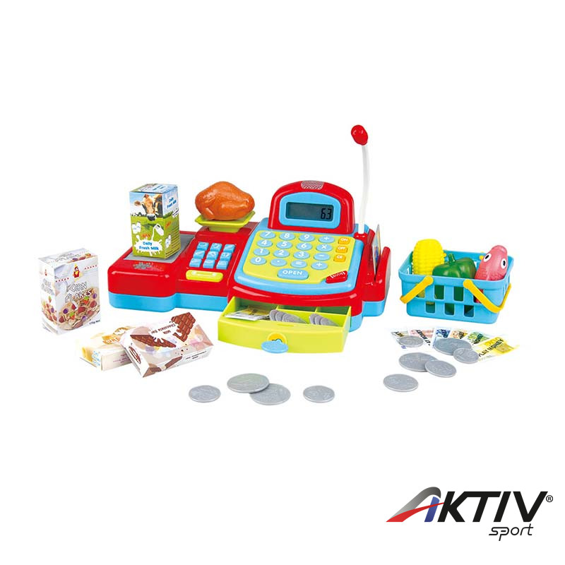 Pénztárgép kényelmes gumi gombokkal rendelkező digitális számológép résszel, kulccsal nyitható kasszával, beépített vonalkódolvasóval, nyomógombbal működtethető futószalaggal, piros visszajelző fénnyel, kézikosárral, mérlegrésszel és különböző játék élelmiszerekkel.