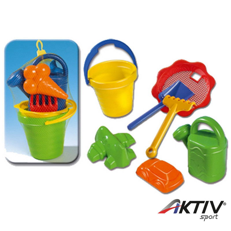 Homokozó játék kisgyermekek számára. 7 részes szett, hálós csomagolásban.