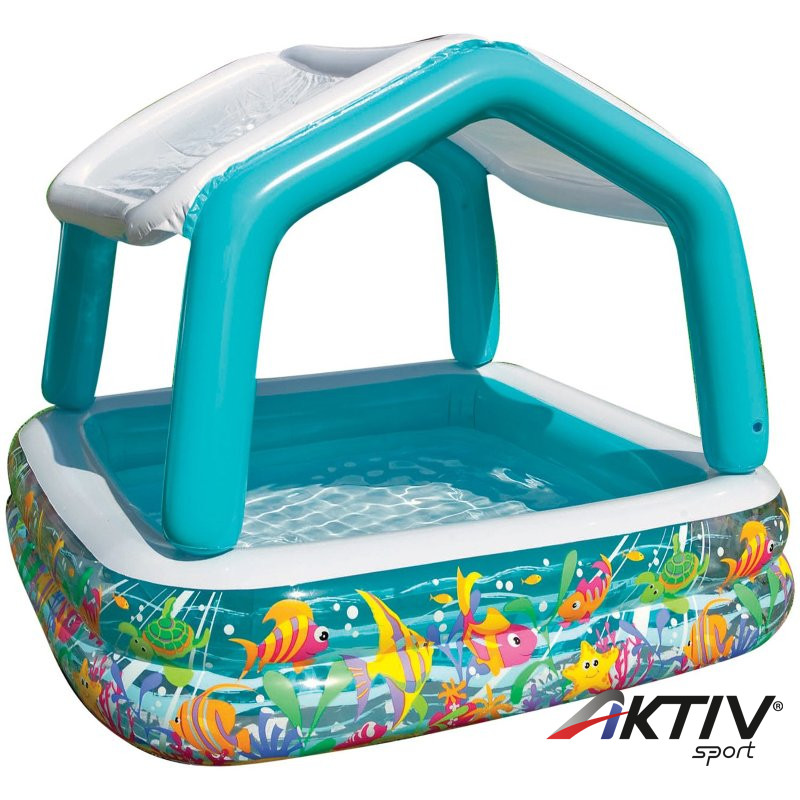 Két légkamrás, felfújható, vidám mintás gyerek medence, levehető (tépőzáras rögzítés) napfénytetővel. Mérete: 157x157x122 cm.