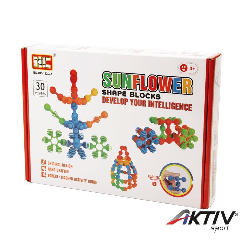 A Napraforgó műanyag 30 darabos építőjáték színes, érdekes formájú építőelemeket tartalmaz, amik több feléleten is tudnak csatlakozni egymáshoz. Csak akaszd össze a virágokat, rudakat, és már kész is egy építmény, vagy egy állat! Az építőjáték fejleszti a gyerekek kreativitását, térlátását és kézügyességét is.