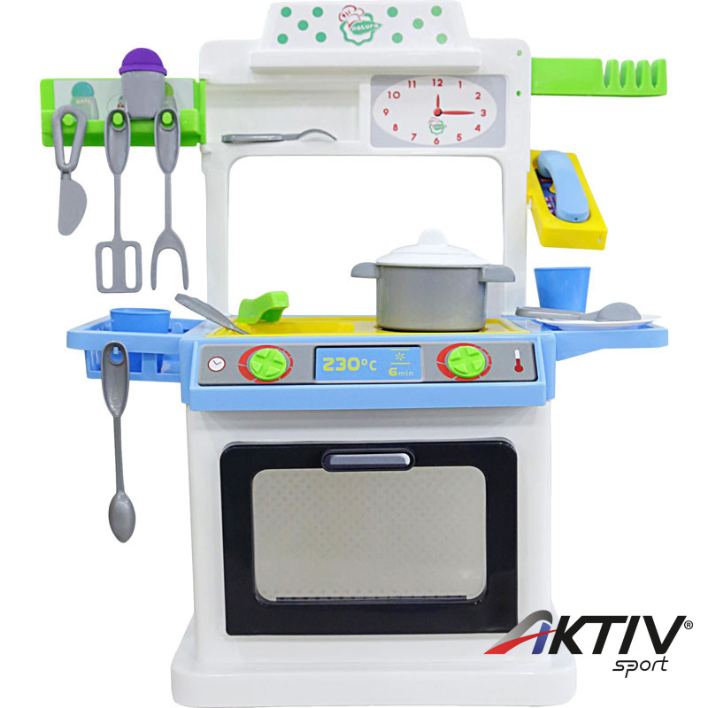 A szett tartalma: tűzhely, sütő, mosogató, csepegtető, 1 db fazék, 1 db tányér, 1 db kanál, 1 db villa, 1 db kés, 1 db pohár, 4 db fakanál, 1 db shaker, 1 db telefon. A sütő ajtaja nyitható.