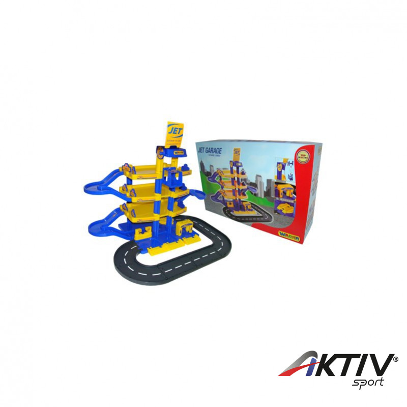 Négy szintes parkolóház, melynek pálya részei az emeletre is felkalauzolják a gyermekeket a kisautóval.