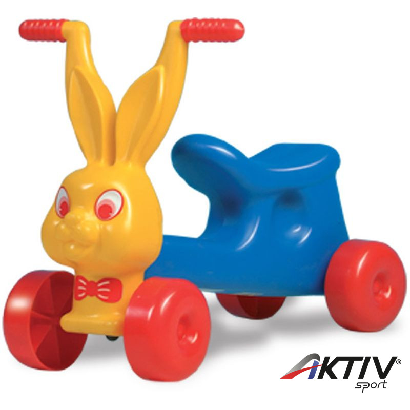 Nagyon aranyos, egyszerű felépítésű, műanyagból készült nyuszi formájú lábbal hajtós kismotor. Az első kerék kormányozható, és műanyagból készült. Méretek: 46x29x37 cm.