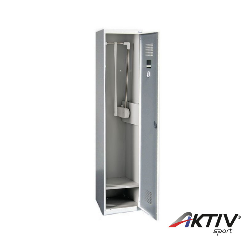 Fém öltözőszekrény mozgáskorlátozottak számára. A lehajtható ruhaakasztó rúdnak köszönhetően ülő helyzetből is lehetséges a karfák függesztése a szekrénybe. A szekrény váza 0,8 mm vastag acéllemezből készül. A szekrény rekesze lehajtható mechanizmussal és egy polccal van ellátva. Más verziókban is kapható. Ha más kivitel érdekli, írjon nekünk, és mi egy egyedi ajánlatot készítünk.