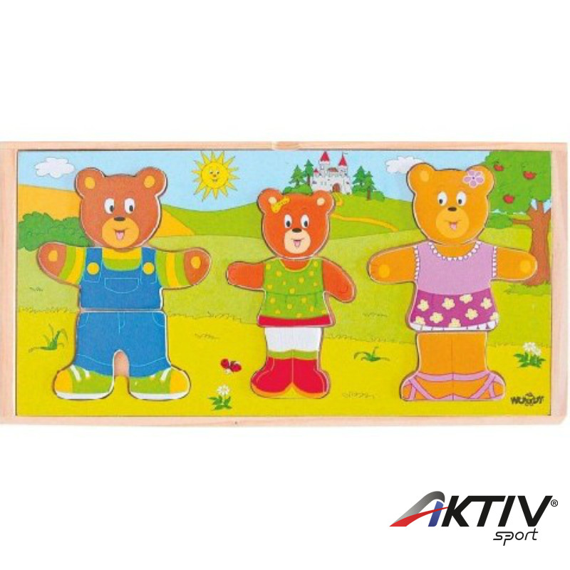 Az öltöztetõ játékok játékok kiválóan alkalmasak a ruhadarabok és a testrészek megismertetésére. A játékban a gyerekek kreativitásuknak megfelelõen öltöztethetik a vidám vagy éppen szomorú macikat (maci figurák 11 cm-sek). Fejleszti a szem és kéz koordinációt, valamint a kreativitást. Színes képek, színes háttérrel. Minõségi fa alapanyag, minõségi festéssel.