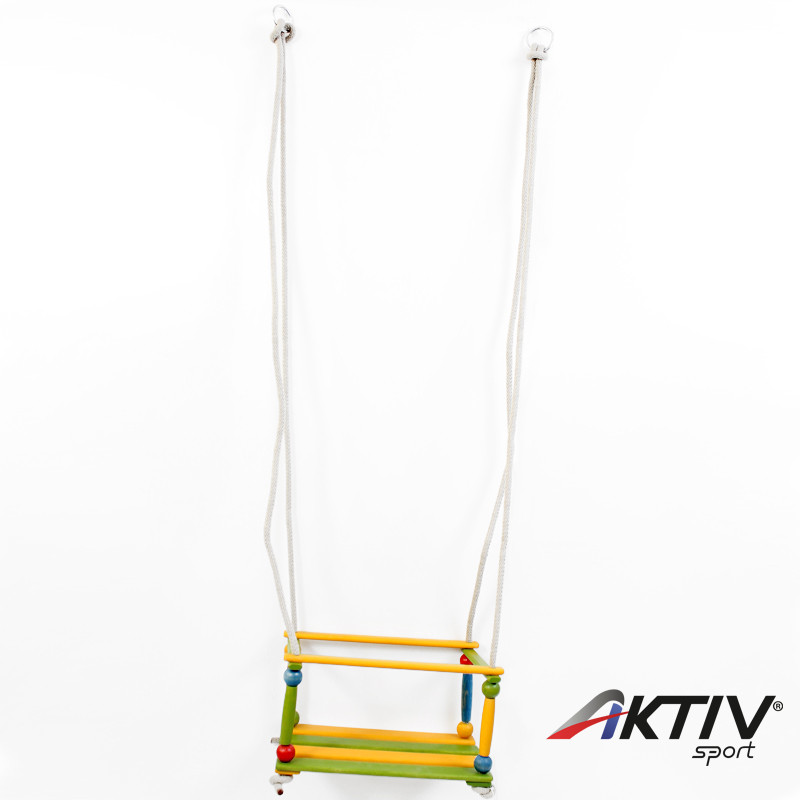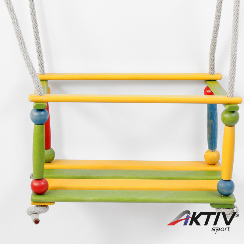 Színes, fából készült hinta golyós díszítéssel gyerekeknek.