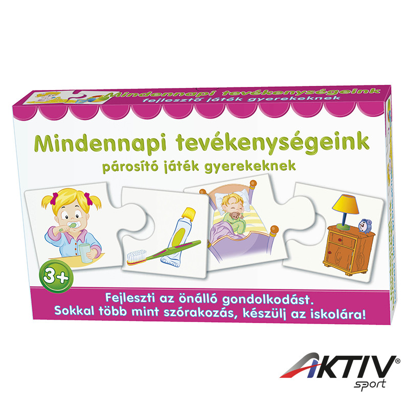 A dobozban 12 db puzzle és párja található, melyek mindegyikén egy-egy tevékenység és az ahhoz tartozó tárgy vagy kellék látható.