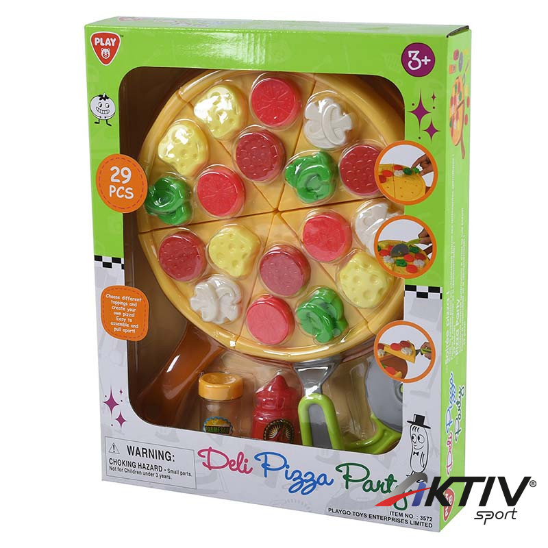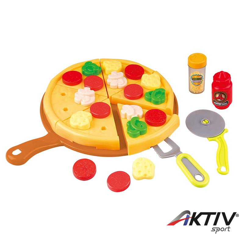 29 részes műanyag pizza készlet, tányérral, evőeszközzel, pizzaszeletelővel, tálalólapáttal, sajtszóróval, ketchuppal, pizzalapáttal és 6 szelet pizzával, különböző feltétekkel.