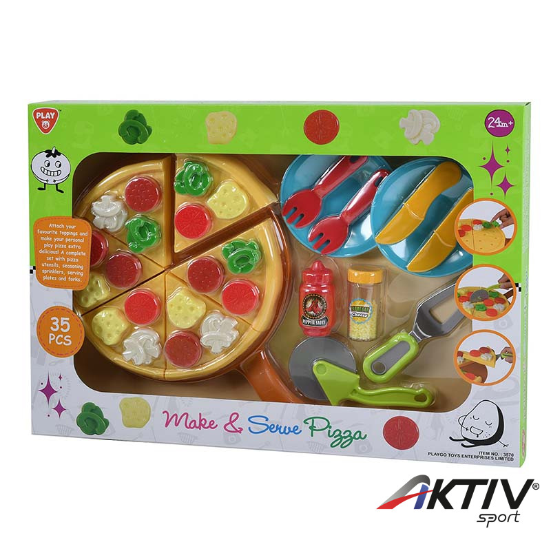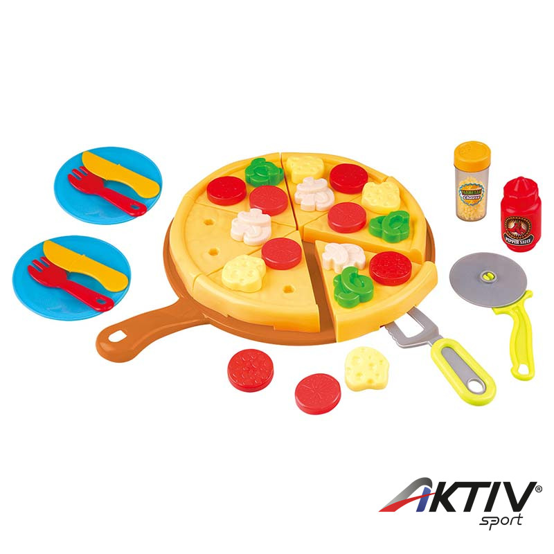 35 részes műanyag pizza készlet, tányérral, evőeszközzel, pizzaszeletelővel, tálalólapáttal, sajtszóróval, ketchuppal, pizzalapáttal és 6 szelet pizzával, különböző feltétekkel.