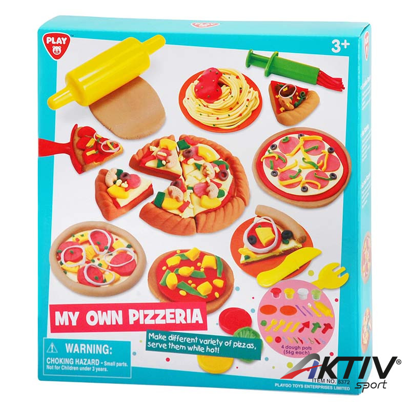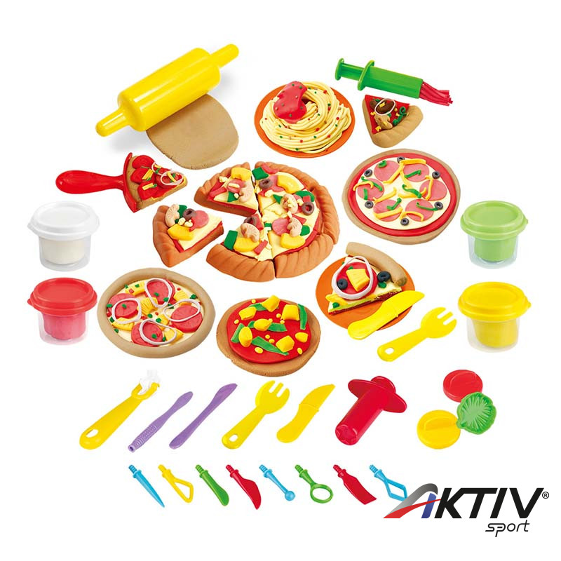Kreatív pizzakészítő gyurmacsomag, 4 különböző színű gyurmával, gyurmaszerszámokkal (henger, szaggató cserélhető fejjel, cserélhető fejű vágóeszközök, spagettikinyomó), 2 műanyag tányér evőeszközökkel, 3 db 3D-s nyomóforma.