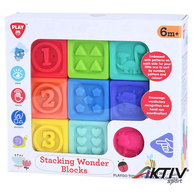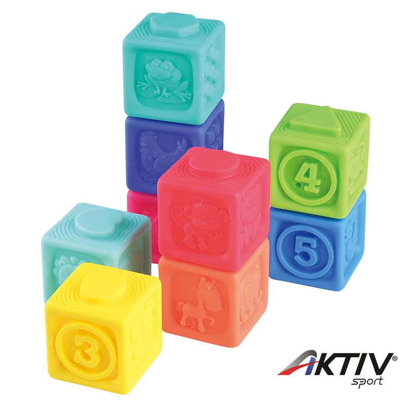 9 darab különböző színű, puha építőkocka, melyek oldalain különböző formák, állatok és számok találhatók.