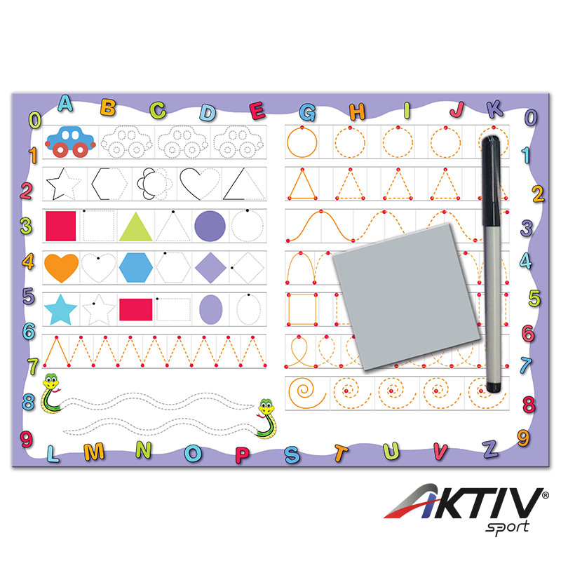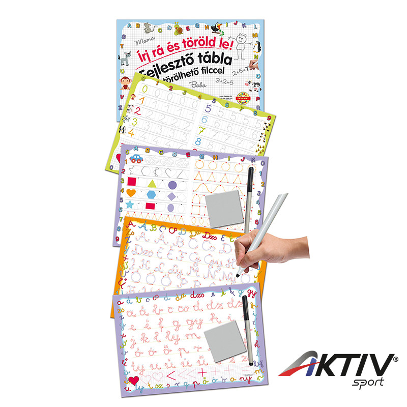 A készségfejlesztő rajztábla letörölhető filctollat is tartalmaz, amellyel könnyen újra lehet kezdeni a gyakorlást.