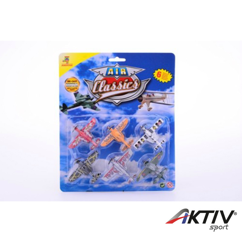 6 db-os retro vadászrepülõ szortiment. Anyaga: fém váz mûanyag kiegészítõkkel. 1 repülõ mérete: 5,5×6,5 cm. A csomagolás mérete: 25×21 cm. 3 éves kortól ajánlott!