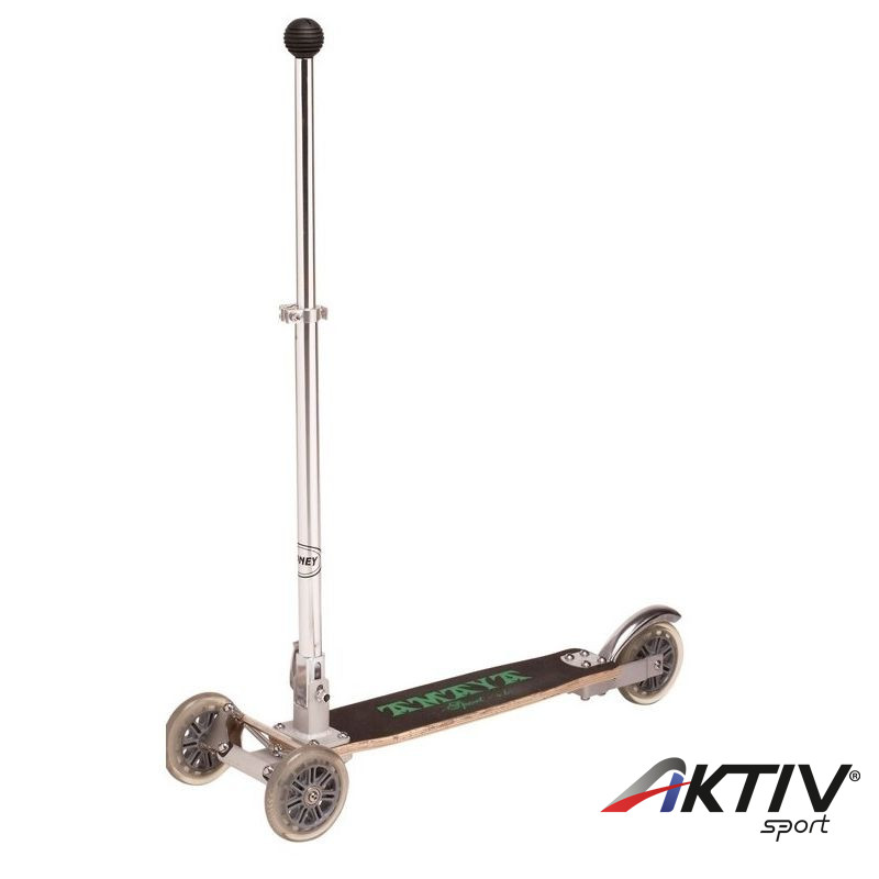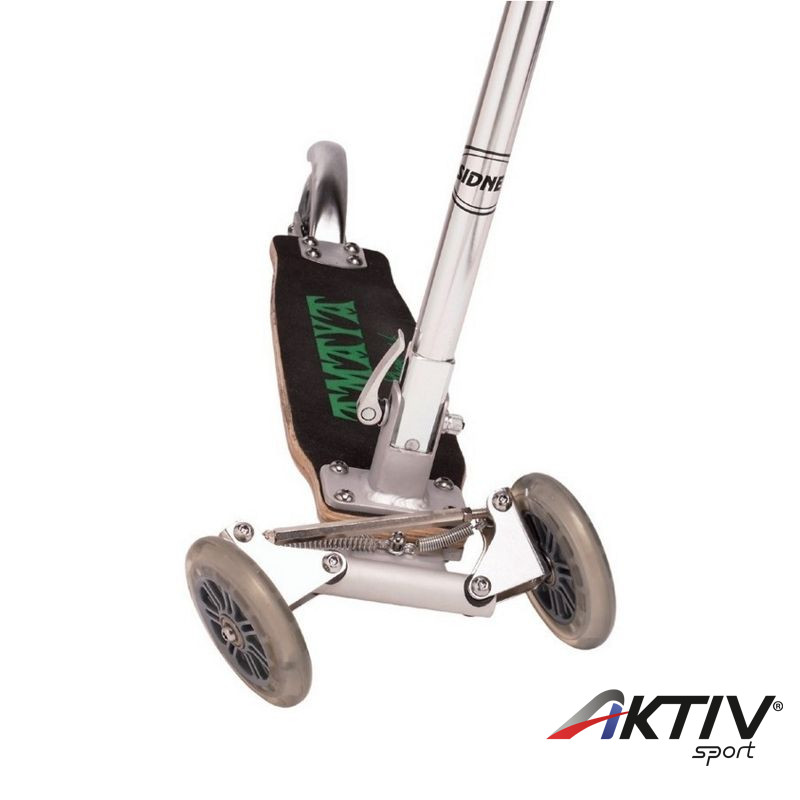 Összehajtható, laminált fadeszkával rendelkező roller hátsó fékkel.
