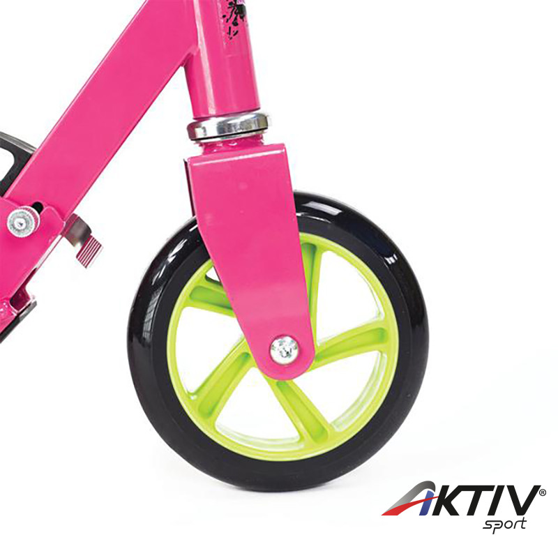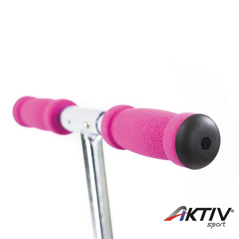 A kormány magassága állítható, a neoprén markolatok pedig kényelmes fogást biztosítanak rollerezés közben.