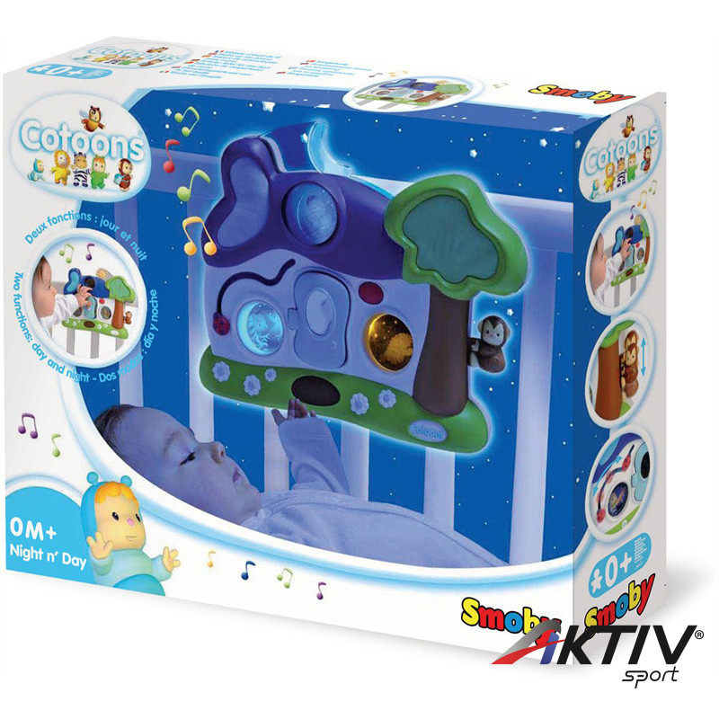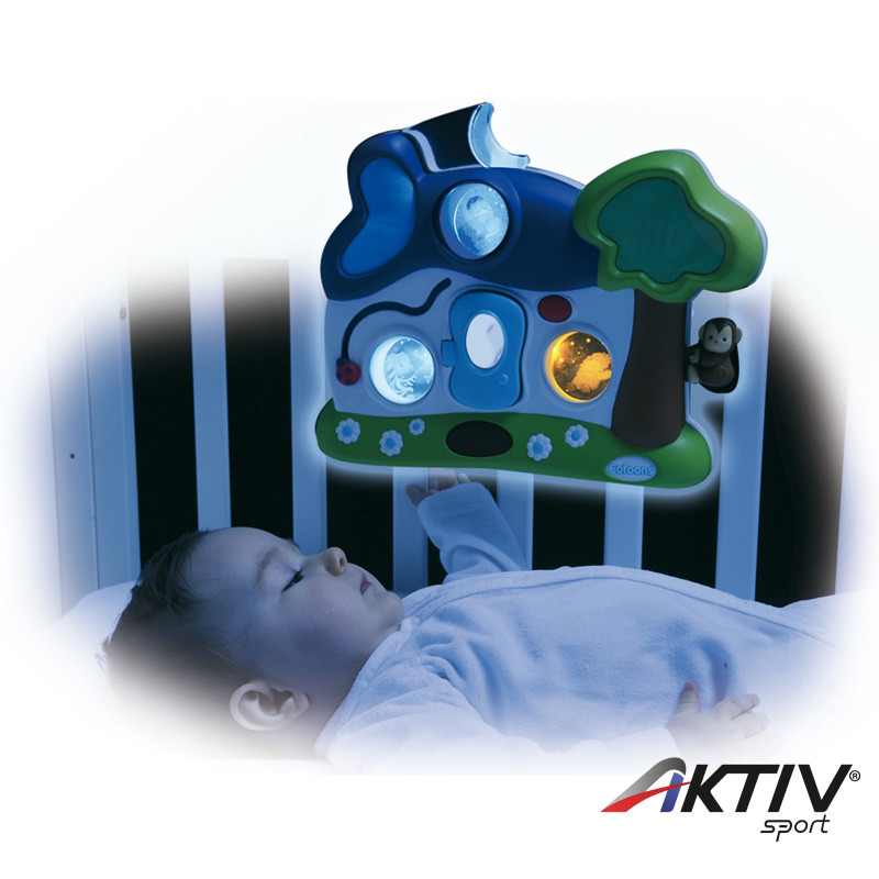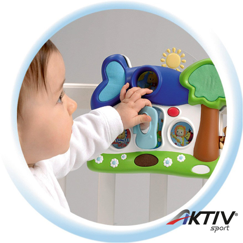 Kiságyra szerelhető világító és zenélő kisházikó. A nyitható kisajtó, a mozgatható majom és a mászkáló katicabogár biztosan hamar gyermeke kedvence lesz.