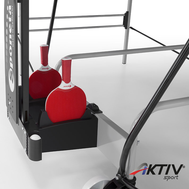 A pingpongasztal 1 db ütő- és labdatartót és 1 db Sponeta Pilot II pingpongháló szettett is tartalmaz!