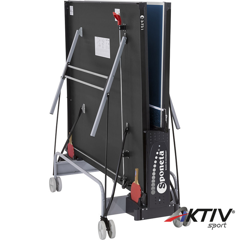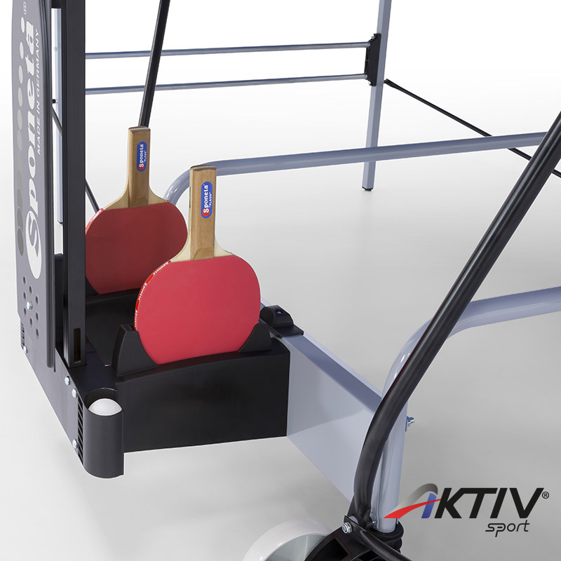 A pingpongasztal 1 db ütő- és labdatartót és 1 db Sponeta Pilot II pingpongháló szettett is tartalmaz!