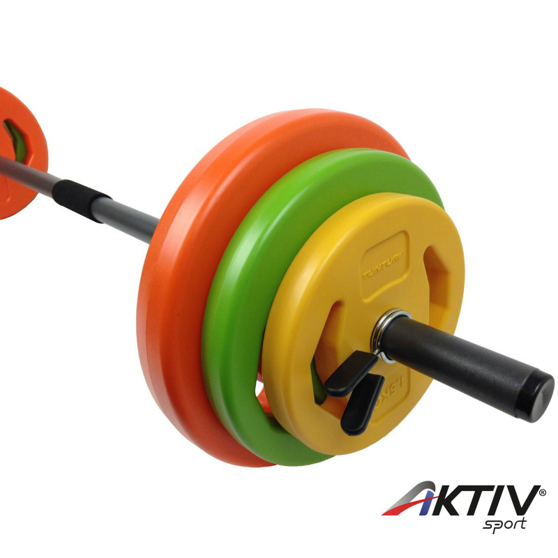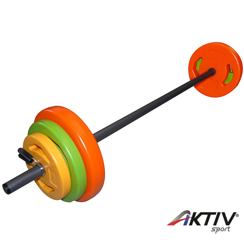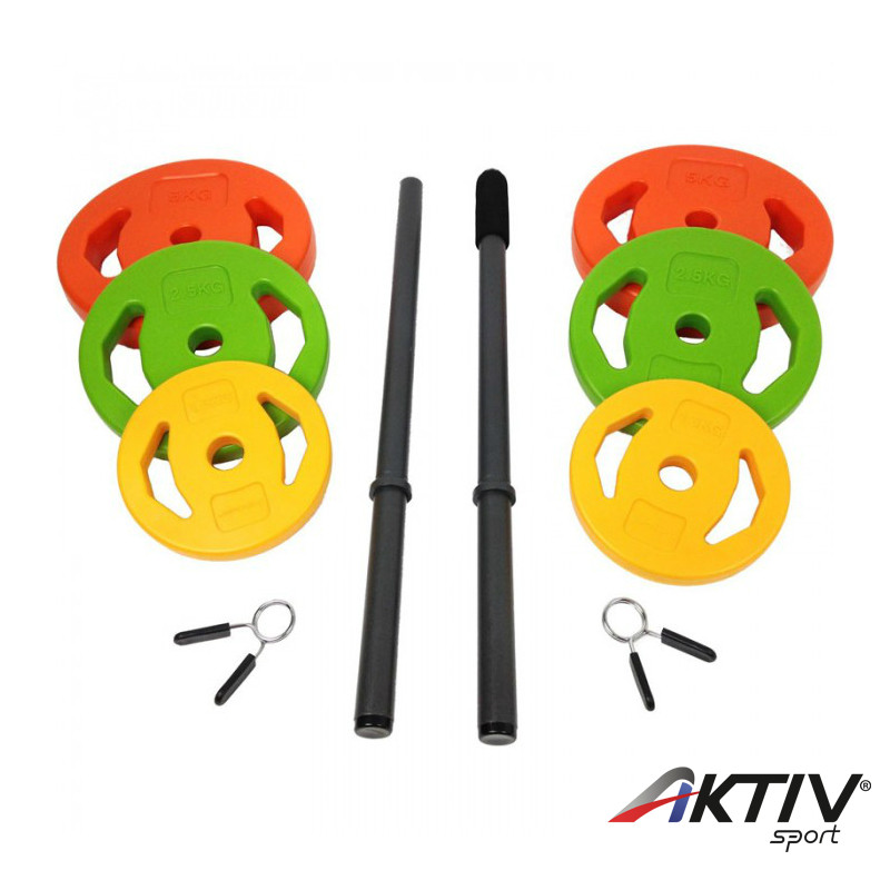 A súlyzókészlet 1 db két részből összerakható kétkezes rudat, 2 db szorítógyűrűt, valamint 2 db 1,5 kg-os, 2 db 2,5 kg-os és 2 db 5 kg-os színes, cement töltetű műanyag súlytárcsát tartalmaz.
